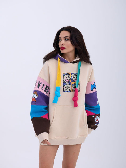 Colorful Patchwork Hoodie with Cartoon Graphics