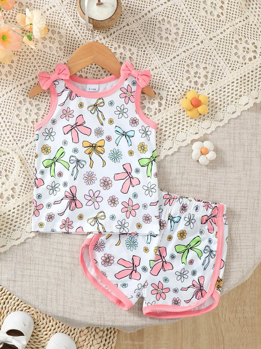 Children's Bowknot & Floral Print Sleeveless Top and Shorts Set