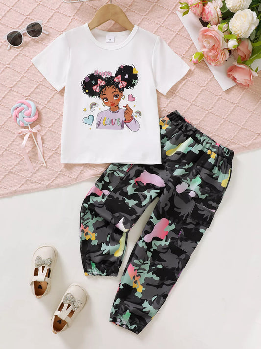 Children's Cartoon Girl T-Shirt & Camo Pants Set