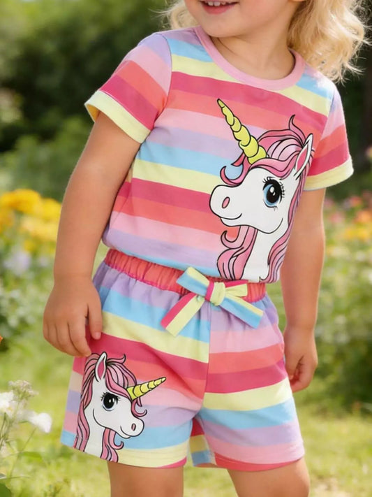 Children's Rainbow Striped Unicorn T-Shirt and Shorts Set