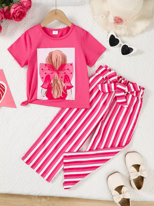 Children's Girly Bowknot T-Shirt & Striped Pants Set