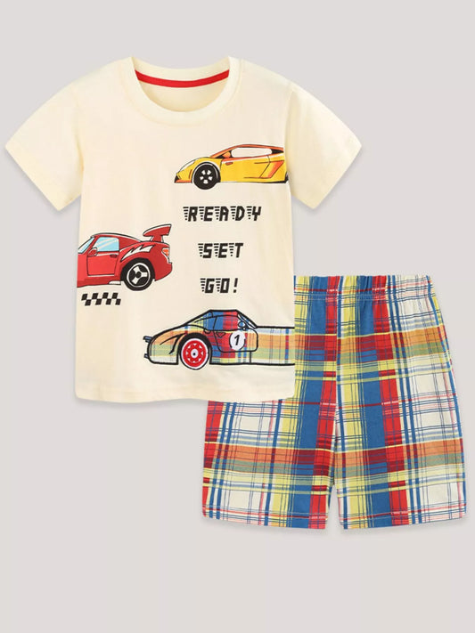 Children's Racing Car Print T-Shirt and Plaid Shorts Set